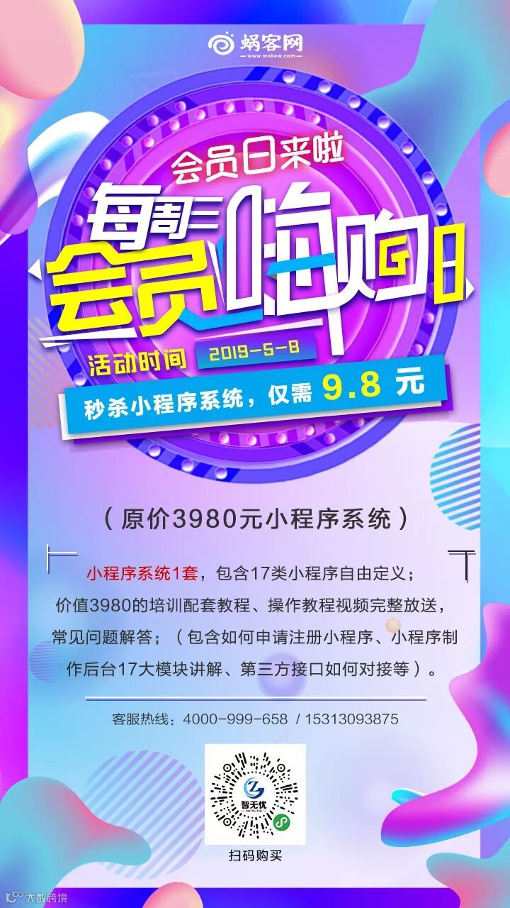 以后每周三都是公司的蜗客会员日,会员日期间98元小程序账号仅需9.8!!!限时秒杀,速速抢购吧!
