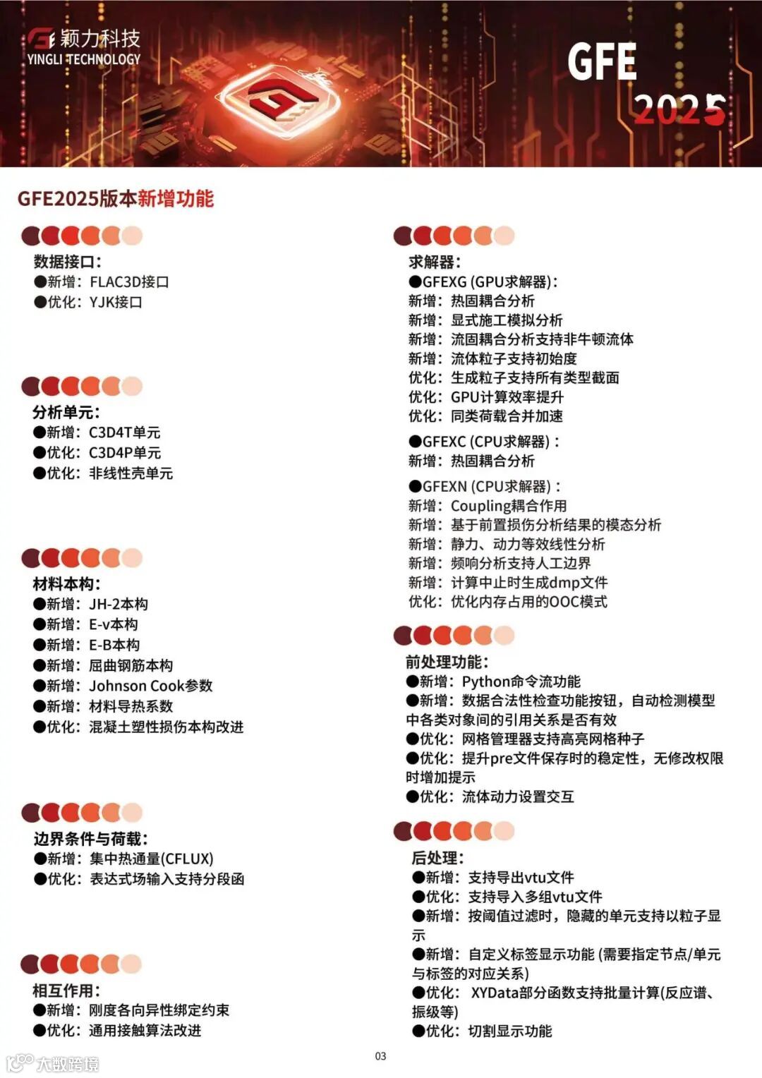GFE软件将CPU+GPU异构并行计算技术和有限元仿真分析方法结合,并在功能研发上综合考虑了国内工程、工业领域的实际应用需求,在保证计算精度的前提下,大幅提升了国内有限元分析软件的计算效率、非线性分析能力、易用性和专业性,其技术思路和软件效率在世界范围内处于领先地位,在工业制造领域、工程设计领域具有广阔的应用市场前景。