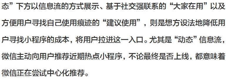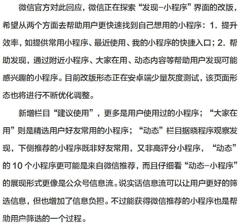 据微信公众号小程序速报消息,微信小程序的主入口近日正在进行内测,通过多任务浮窗留存用户之后,微信正在想办法增加优质小程序的曝光量。继多任务浮窗之后,微信小程序或将上线中心化入口。在最新的微信内测版本中,“发现-小程序”入口内页焕然一新,主要栏目在原本的“附近的小程序”、“我的小程序”、“最近使用”三大部分基础上,新增了“建议使用”、“大家在用”、“动态”等栏目,且位置更加明显。