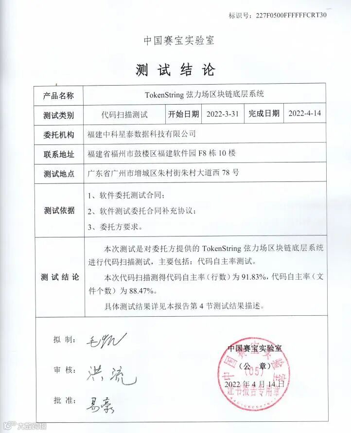 权威认证!自主可控!Tokenstring弦力场区块链底层系统通过工业和信息化部电子第五研究所代码扫描测试,扫描测得代码自主率(行数)为91.83%,代码自主率(文件个数)为88.47%。是截止目前通过认证唯一超过90%的区块链技术,位居全国区块链自主研发认证领先位置,在重庆所有区块链企业中代码自主率排名领先,为国产自主可替代产品。