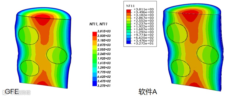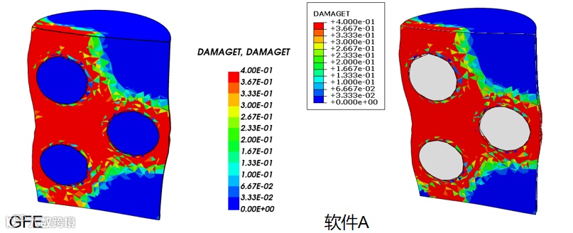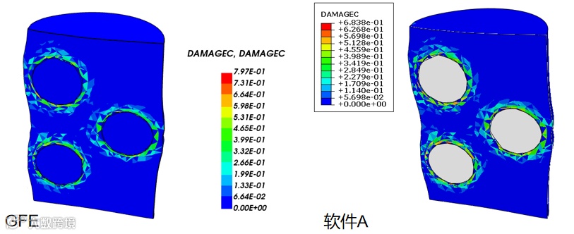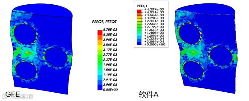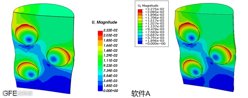 采用GFE对简化的骨料砂浆模型进行热固耦合分析,并将计算结果与国际著名通用有限元软件A结果进行对比,计算结果表明,GFE温度、位移、损伤、塑性应变等结果与软件A结果一致,验证了GFE热传导分析功能以及热应力分析的正确性。