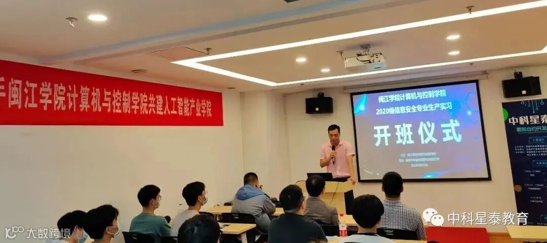 2022年6月13日上午,闽江学院计算机与控制工程学院2020级信息安全专业生产实习周开班仪式在中科星泰数据科技有限公司举行。闽江学院辅导员连至助老师、中科星泰教育投资有限公司林松波总经理、中科星泰教育投资有限公司胡淑滨校长、中科星泰数据技术有限公司陈洪华工程师等参加活动。