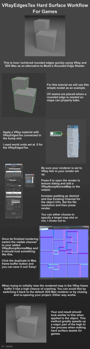 付一个vray+Max的快速烘焙光滑边角的法线贴图教程: