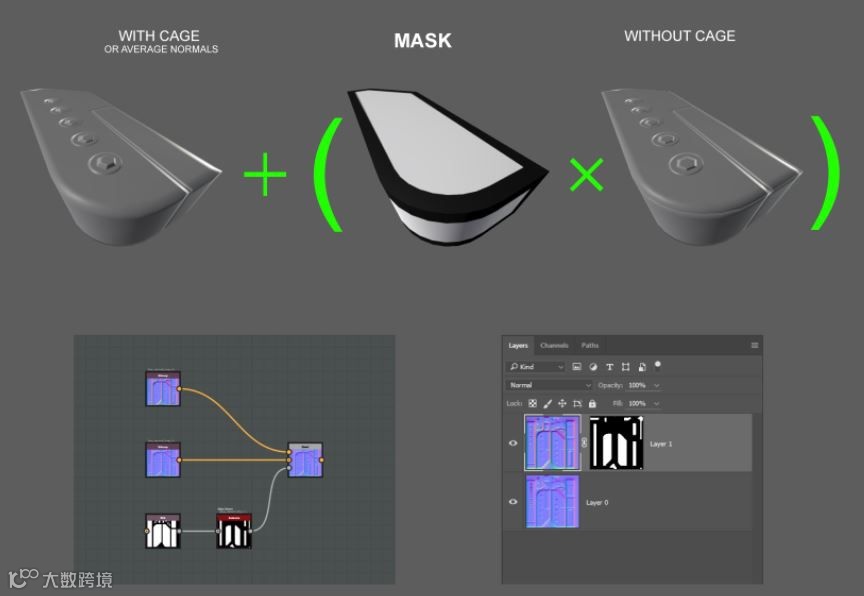 我在Max烘焙法里提到Cage,其实Cage的作用和在Painter里勾上“Averaged Normal”的效果是一样的。烘焙出的贴图表面失真,边角良好。其实还是要用到蒙版,然后再把边角好的贴图和表面好的贴图合在一起才能达到完美。