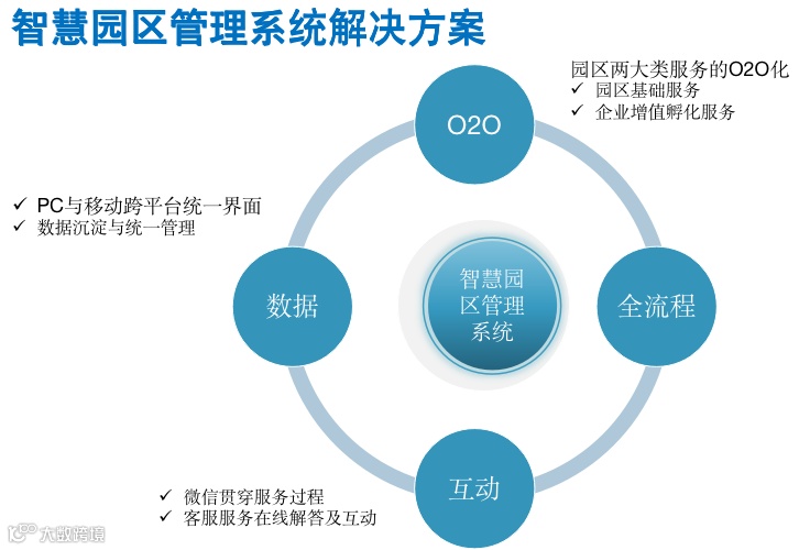 协调政府、企业等各方资源,实现管理、工作、生活智慧化三位一体。通过智慧园区系统,产业园区内可以及时传递交互信息资源,以提高园区产业集聚能力、企业经济竞争、可持续发展为目标。