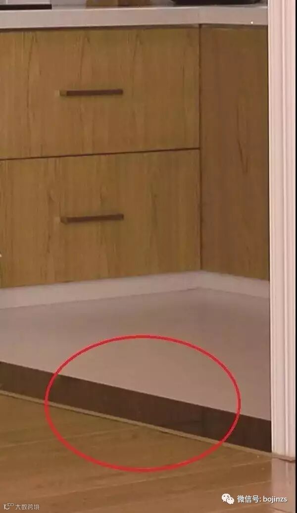 ▼问题4 踢脚线无谓拼接:踢脚线收口做了无谓的拼接,且拼接的木线条木纹不一致。