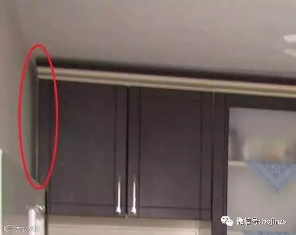 ▼问题1 吊柜与墙面间隙过大,影响美观:厨房橱柜安装时保留适当的间距以便于安装,但是间距也不能过大影响美观,规范的间距应小于1cm。