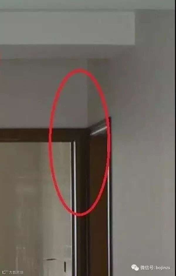 ▼问题2 卫生间墙面阴角不垂直:阴角不垂直导致安装门套时未能垂直于墙面,与隔壁房门门套无间距。