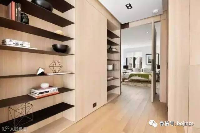 △进卧室的过道空间很大,用木板打造行走中的衣帽间,再用黑色的隔板隔出展示收纳区。