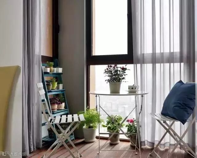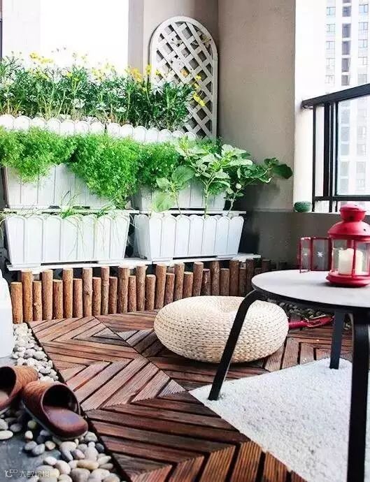 如果是阳台面积较大又位于顶楼,应该属于“露台”。可在阳台上加透明的弧形采光顶,就可使阳台当作房间使用。阳光通过采光板洒向用韩国文化石做的墙壁,以及青石板铺成的地面,而且也照亮了“人”字型的鹅卵石小径……这些园林造景手法,用在阳台上,会给人浓浓的休闲气息。