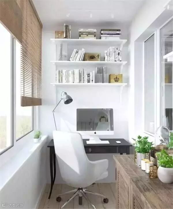 将阳台用玻璃和木材封闭成居家小书房,窗外的绿叶仿佛伸手可及,好像马上就会进入居室,自然与居室就这样在阳台这个小小空间相交融。为了节约空间,可将书桌、书架和文件柜都设计得很小巧别致,既提供了完善的实用功能,又不多占空间。