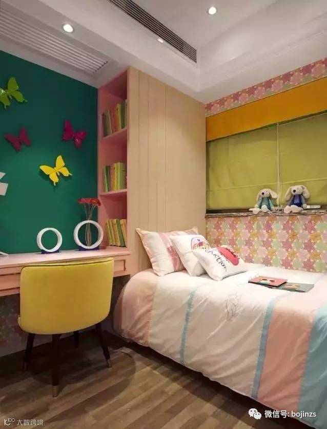 ▲用粉色和绿色打造一个可爱、温馨的公主房,床头做了储物和书桌一体的柜子,非常实用。