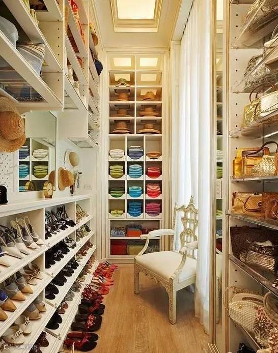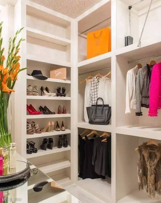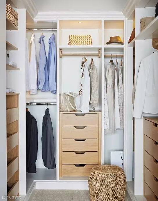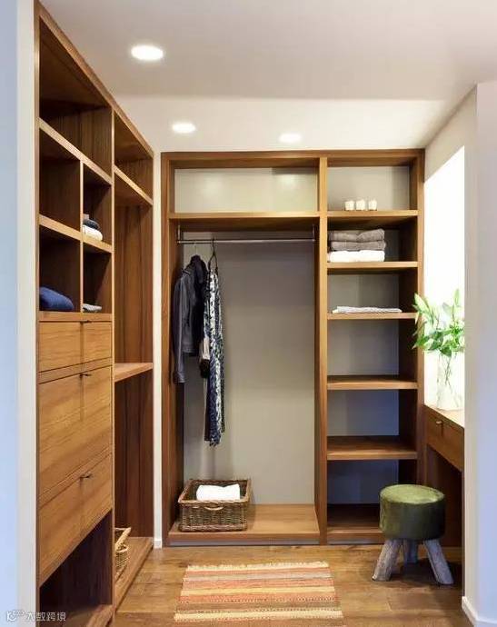 优缺点:比较好的一种形式是利用一面空墙存放,不完全封闭。优点是空气流通好,宽敞。不过缺点是防尘差,因此防尘是此类衣帽间的重点注意事项,可采用防尘罩悬挂衣服,用盒子来叠放衣物。为便于区别,可增加一些标志。若多设一些抽屉、小柜,则更为实用。