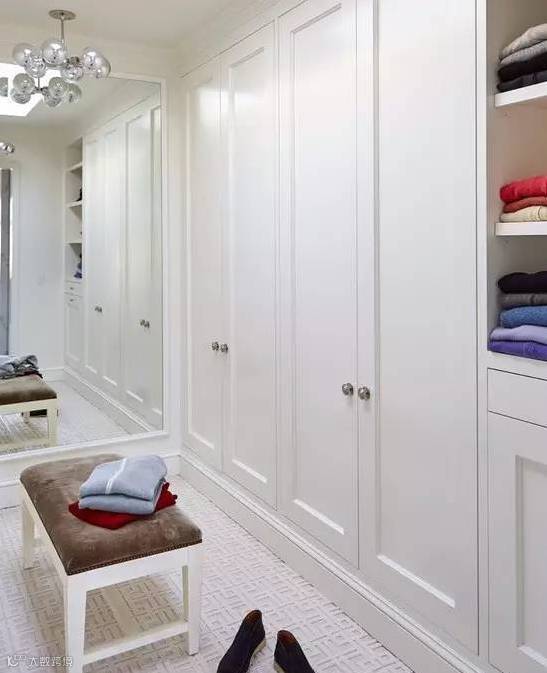 如开放式衣帽间是针对比较大空间,利用一面空墙来存放,不完全封闭,这样的衣帽间尺寸相对较大;独立式衣帽间,故名“独立式”。