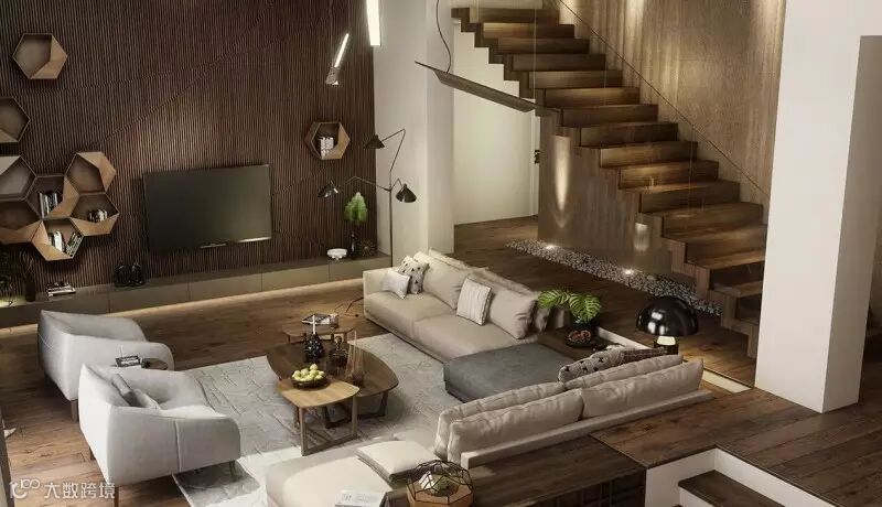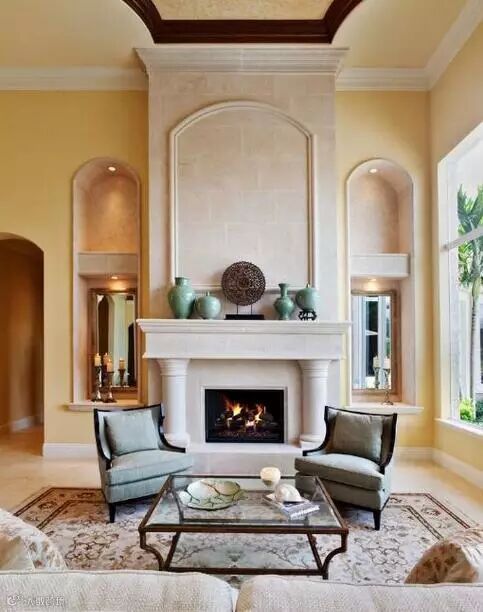 用壁炉来突显房间高度也是一个不错的创意。面对直到天花板的壁炉,会产生不一样的感觉。