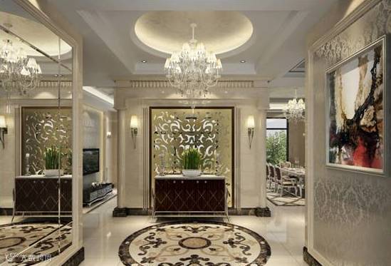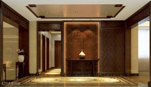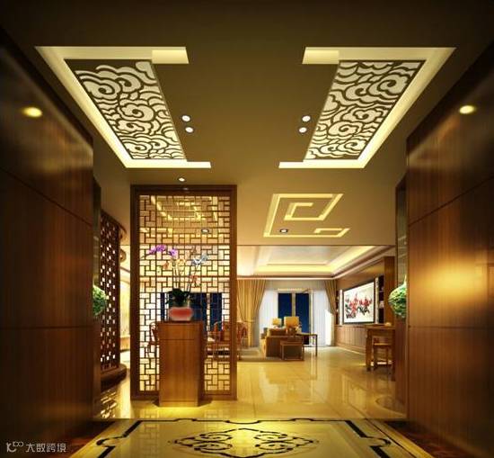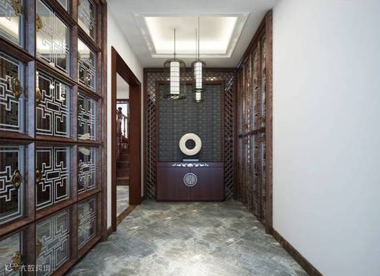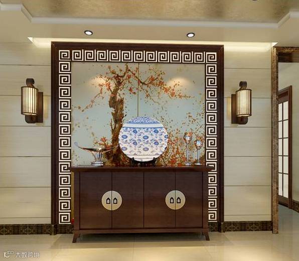 从风水角度来看,玄关讲究下实上透。玄关间隔上面以通透为主,能够保证进门的采光,不会因为玄关给完全挡住了;下面以实心为主防止财运外泄。上面的材质可以选择透光性好的玻璃材质或空心博古架等,而下面最好是能够选择实心而又厚实的材质。