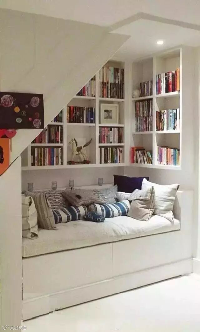 如果你的房间有一个小角落,可以利用这个地方在墙壁上安装折叠桌用于用餐——这个是一般人都能想到的。但你还可以给这个空间做个地台,让整个用餐的地方垫高二十公分,然后地台装上隐形抽屉就可以收纳很多物品了。▼