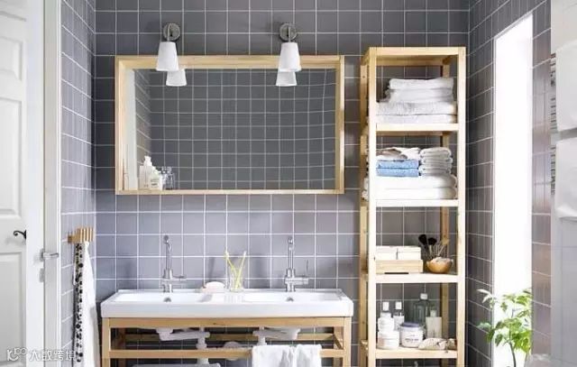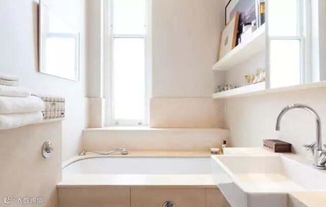 面盆上部安装置物搁板 无论是在台盆表面还是在浴室柜的台面上,放过多的清洁卫生用品都会显得杂乱无章,而且容易碰倒,因此不妨在面盆上部贴墙的位置钉上10厘米宽的搁板,只要能放得下化妆瓶、刷子、洗漱杯等便可以了。搁板高度以不妨碍使用水龙头为宜,材料可选用木板、玻璃等。