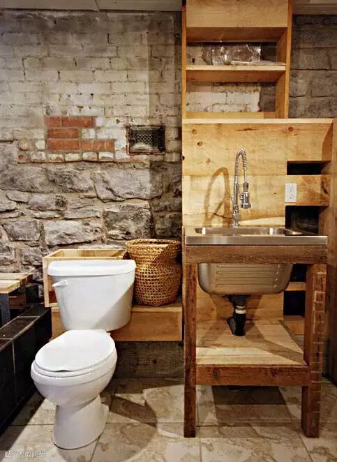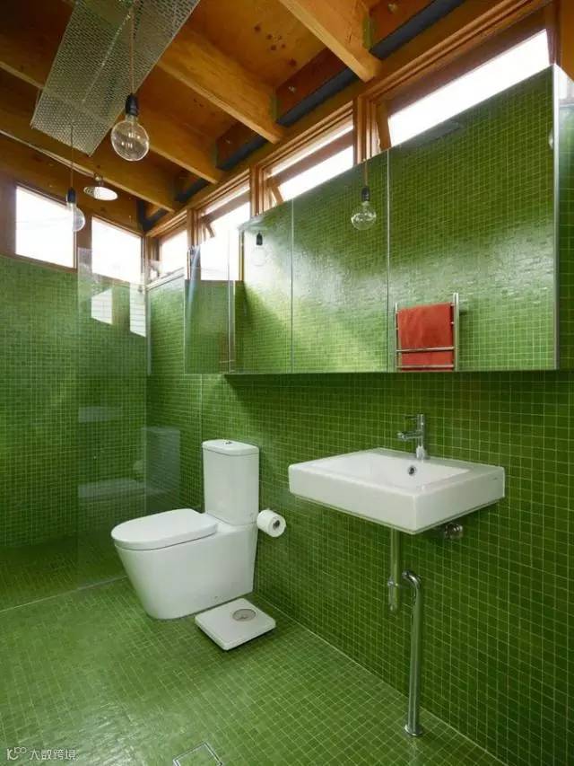 当最健康的绿色遇见了卫生间,想必多逗留几秒在镜子前臭美也是一种享受。木色屋顶+上方窗景的设计,特别、精致。