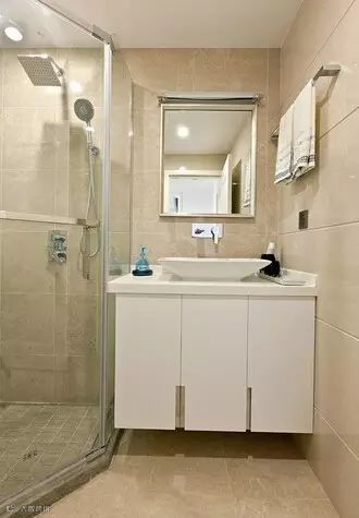 洗面盆拒绝柱盆:在小卫生间里尽量不要安装柱盆,因为下面的柱体空间几乎无法利用,除非包裹在专门定制的浴室柜里,两项花费加起来还不如买个幅面偏窄的台上盆,省下的钱再购置一个容积超大的台下柜。再添置一些存放零散物品的小柜或支架,加上皂碟和毛巾杆等五金件,超省钱和省空间的卫生间装修就大功告成了。