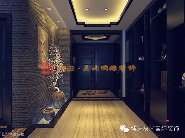 入户走廊的设定为中式韵味增添了不少色彩,凹形吊顶让整个走廊凸显大气和厚重。两侧的博古架和饰品更是让整个空间显得儒雅和内敛。如此造型的吊灯也是新中式风格的典范。