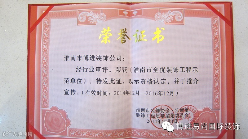 通过我们的不懈努力,不仅得到了广大淮南业主的肯定,而且也得到了业内人士的肯定,淮南装饰协会于日前特颁布“淮南市全优装饰工程示范单位”、“绿色环保装修合格达标企业”两大荣誉证书予以肯定和嘉奖,本次获奖是对博进装饰自开业以来,在淮南家装行业领域所做出贡献的肯定,也是未来博进装饰成为淮南家装行业领军品牌道路上的新起点。博进装饰定将以绿色环保型家饰材料,给广大装修业主一个健康温馨的家园,让您装的放心,住的更放心!