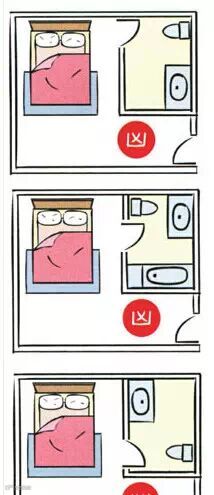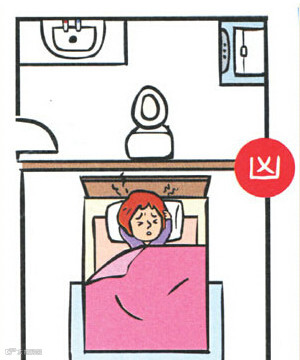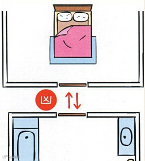 房间里的厕所对到床,情况比房门对到厕所严重,对到头,会头痛、思考时不能集中,住久了会产生肿瘤、中风等;对到腰,会腰酸、心脏无力、水肿,住久了会产生糖尿病、心脏病;对到脚,会坐骨酸痛、膝盖无力、痛风水肿,住久了会产生意外骨折。