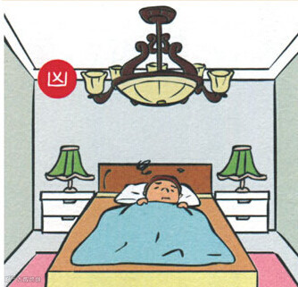 卧房的天花板,应简单为宜。千万别学商业空间,弄得非常艺术、奇特、花样百出,甚至装上镜子,这会使人不易入睡,久而久之健康会出问题。床位上方不可挂奇形怪状的灯具,会使人产生紧张不安的感觉。在地震频发的当今,床的正上方最好是完全没有任何灯具,卧室照明尽量使用床头桌灯或立灯及靠近墙边的隐藏灯管。