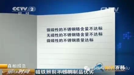 专家随即表示,用一块普通的磁铁也能辨别不锈钢的好坏。如果不锈钢制品的磁性很强,那证明它几乎是纯铁的,既然是铁的,外观又这么亮,那说明它是电镀产品,不是真正的不锈钢。真正的不锈钢制品里面也含有铁,也有一点点磁性,但磁性比较弱。这一方面是因为铁含量比较少,另一方面表面镀膜之后,有了阻止磁性的特性。