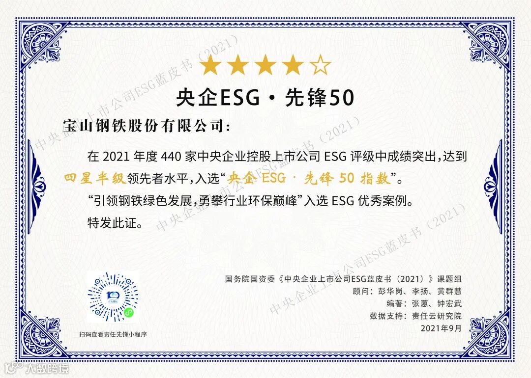 活动发布了首本《中央企业上市公司ESG蓝皮书(2021)》,首次发布“央企ESG·先锋50指数”。该指数以440家中央企业控股上市公司为评价对象,通过对ESG管治、社会价值和社会环境风险管理的综合评价,选出表现最好的前50家上市公司。宝钢股份、太钢不锈、马钢股份成功入围。其中,宝钢股份达到四星半级领先水平,位列“央企ESG·先锋50指数”第七位。