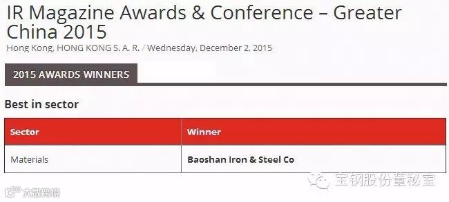 2015年12月2日,英国IR杂志(IR Magazine)主办的大中华区投资者关系评选结果正式公布。宝钢股份荣获材料行业最佳投资者关系奖(Best in sector)!同时获得卓越投资者关系证书!此次评选,材料行业共有3家企业获得提名,钢铁行业仅宝钢股份一家入围,最终宝钢股份获得该奖。