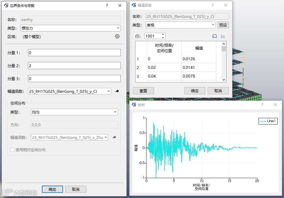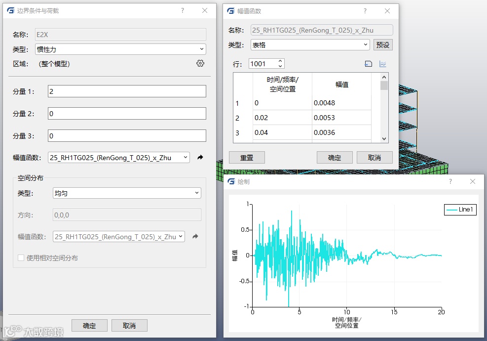 在GFE中进行中震弹性分析及大震弹塑性分析时地震作用按整体惯性力输入。中震弹性分析时,地震波幅值函数的峰值加速度200gal,大震弹塑性分析时,地震波幅值函数的峰值加速度400gal,地震作用设置如下图所示。