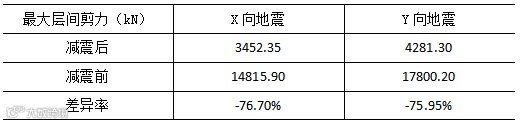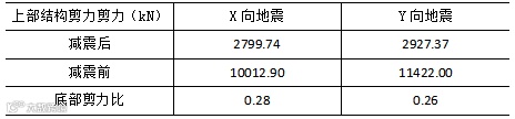 中震弹性工况下X向地震下底部剪力比为0.28,Y向地震下底部剪力比为0.26,故本结构的底部剪力比为0.28。根据《建筑隔震设计标准》6.1.3第二条,上部结构可按本地区设防烈度降低1度确定抗震措施。层间剪力结果如下图所示,最大层间剪力对比如表4所示。