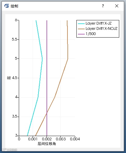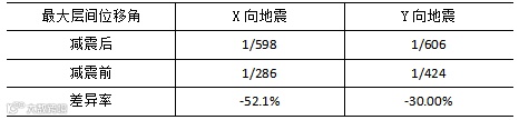 本项目隔震后中震弹性层间位移角均满足《建筑隔震设计标准》4.5.1条规定的1/500的限制要求。层间位移角结果如下图所示,最大层间位移角对比如表3所示。
