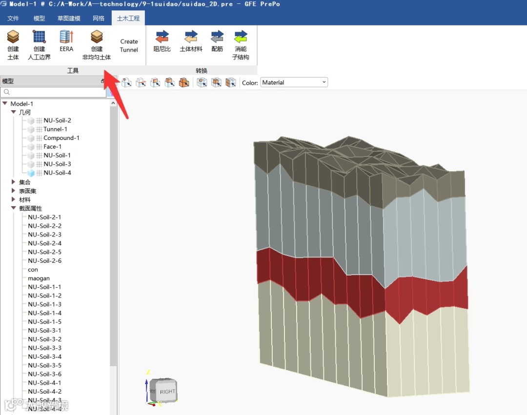1、GFE非均匀土体建模方便简捷,可同时输入土层材料以及钻孔数据对土体进行建模;