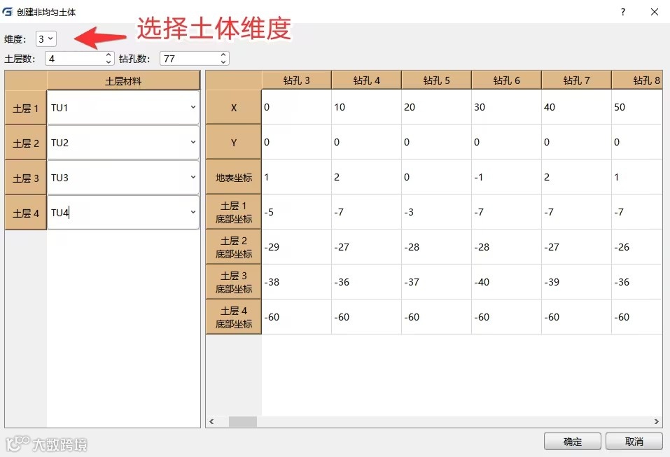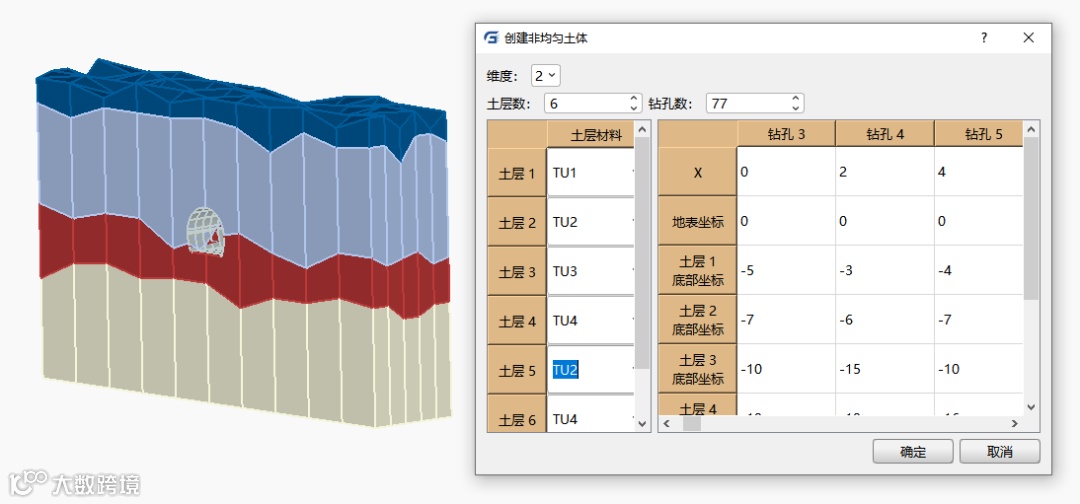 4.X为钻孔位置的横坐标,地表坐标为钻孔位置的纵坐标,土层底部坐标指土层底部在所建立的坐标系下标准高度。点击确定,即可生成所要创建的非均匀土体模型。