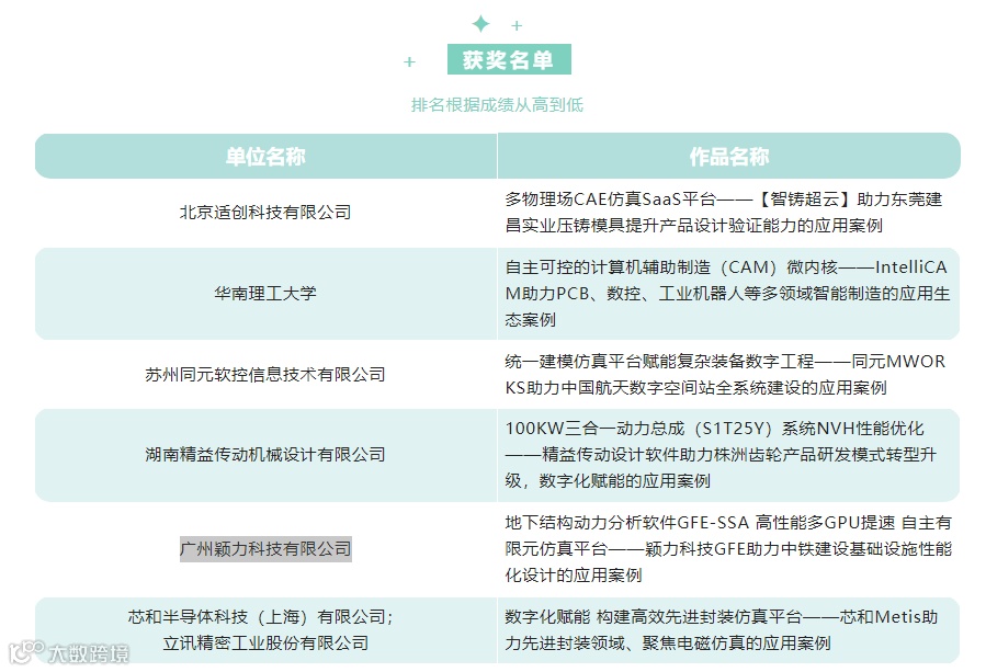 大赛自今年9月正式启动,开赛即受到产业界高度关注,共收到全国120支团队提交的优秀实践案例,通过初赛的激烈角逐,其中53支团队晋级决赛。评委专家们针对提交作品的技术创新、产业应用和价值体现等方面进行答辩交流探讨,最终遴选出包括颖力科技《高性能多GPU提速 自主通用有限元仿真平台 —— 颖力科技GFE助力基础设施和能源设施性能化设计的应用案例》在内的20个案例获得本届大赛的最佳实践奖,我司更是获得了第五名的好成绩。