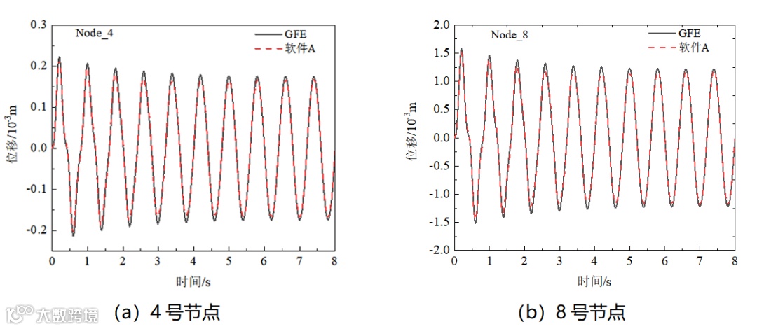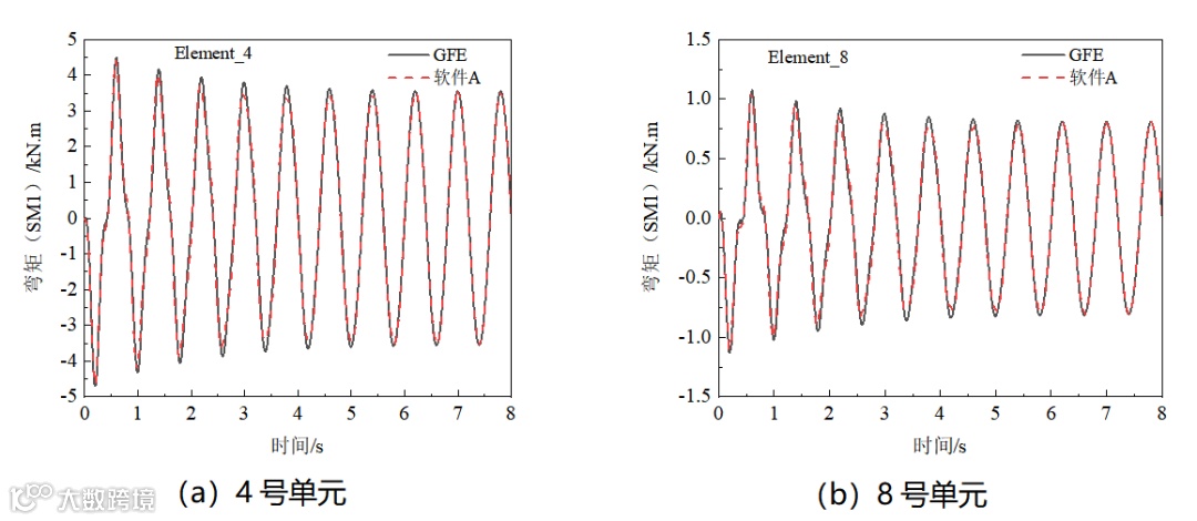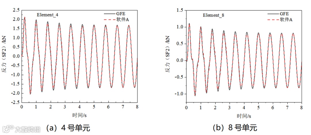 在悬臂梁上施加随时间正弦变化的惯性力载荷,幅值为1m/s2,加速度时程如图6所示。选取悬臂梁上若干节点和单元,如图7所示,输出其位移、剪力和弯矩结果进行分析对比。图8为节点的Y方向位移时程,图9和图10分别为单元的Y方向剪力和X-Y平面内弯矩。由图可知,两款软件的计算结果吻合较好。