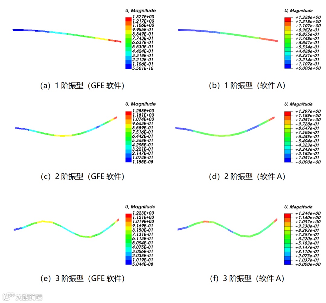 进行上述悬臂梁模型的模态分析。前三阶固有频率如表5所示,可以看出,两个软件的计算结果差异小于2%。前三阶振型如图5所示,可以看出,两个软件的计算结果吻合较好。