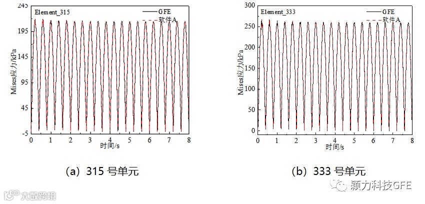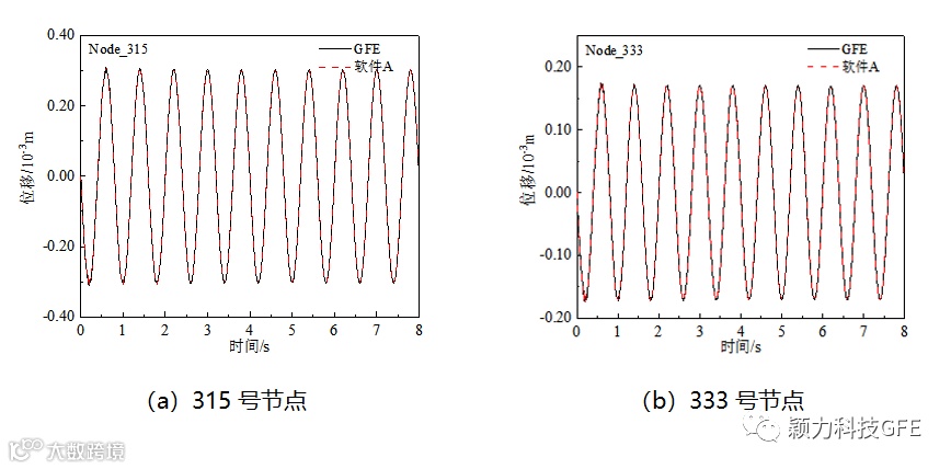 对模型整体施加X方向的随时间正弦变化的惯性力载荷,幅值为10m/S2,加速度时程如图5所示。选取模型若干节点和单元(图6)的位移及Mises应力结果进行对比分析。图7为节点的X方向位移时程,图8为单元的Mises应力时程。由图可知,两款软件的计算结果完全吻合。