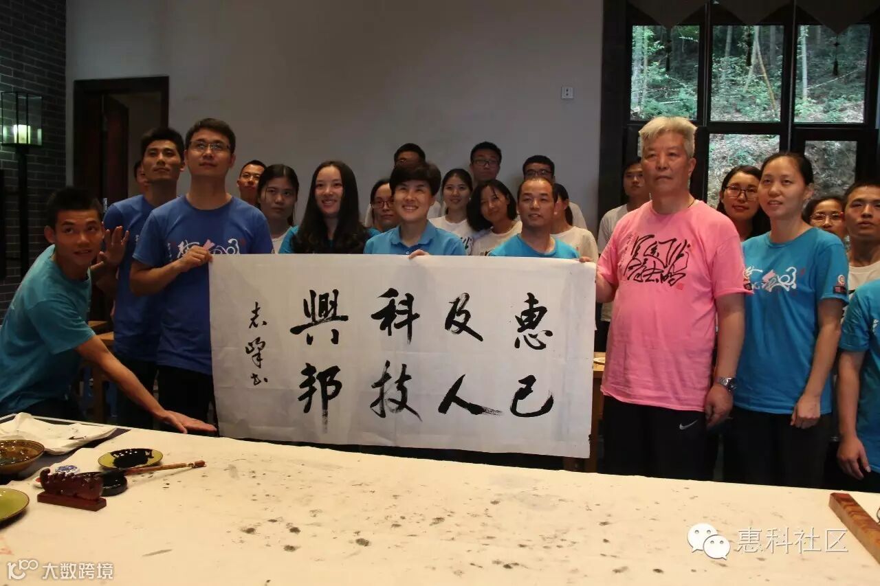 体会过了求道之艰,终于抵达此行的目的地道源书院。在这里,北大公益的志愿者们与惠科人一起进行了一场别开生面的分享会,轻松欢快的氛围下畅谈接触北大公益后的感触,兴致高处,北大公益志愿者志峰学长挥毫泼墨,为惠科写下了新解:惠己及人,科技兴邦。