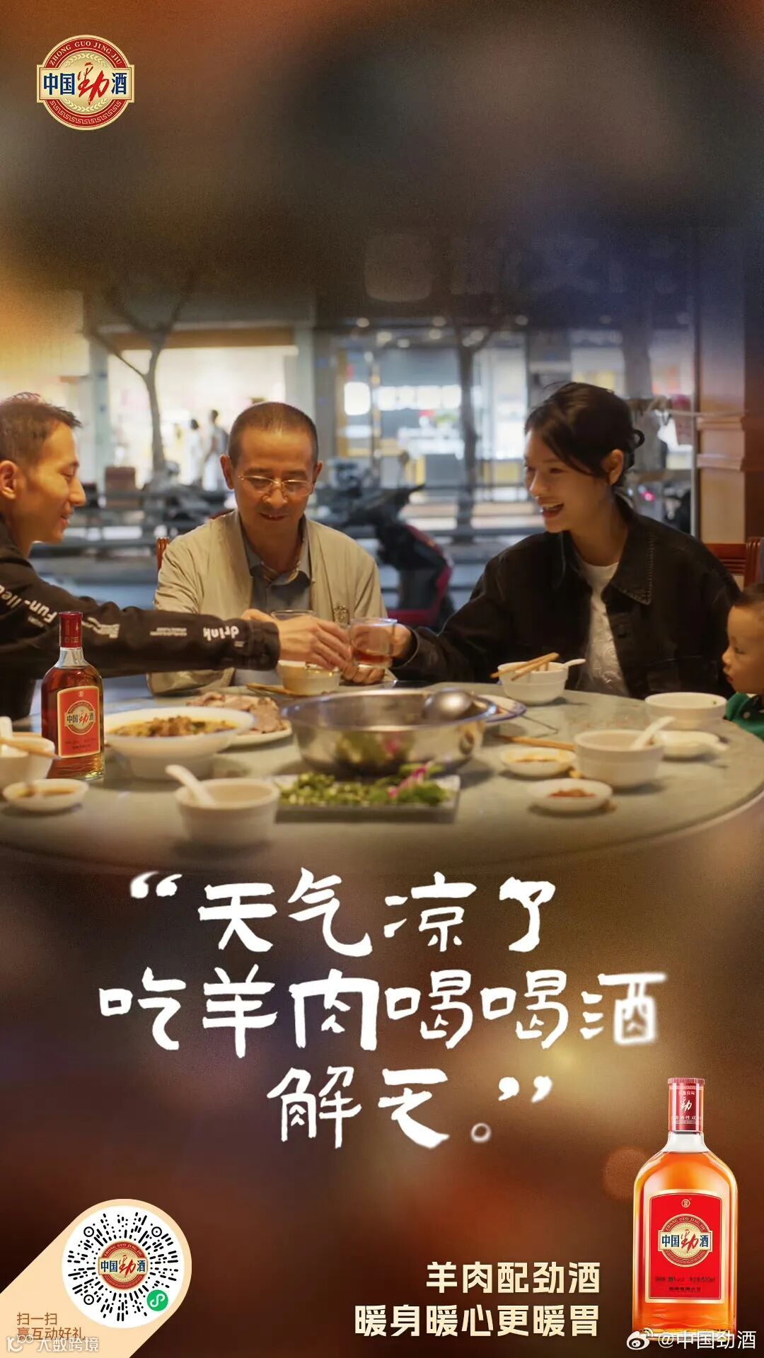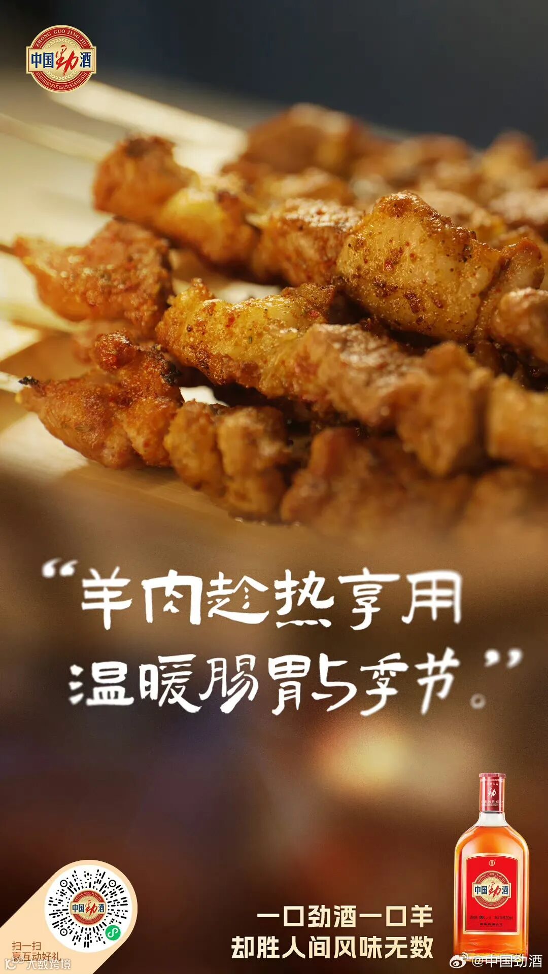 比如,将羊肉的暖胃与劲酒的暖身相融合,打造温暖治愈的羊肉季。羊肉季在内容层面上营造“羊肉配劲酒,暖身暖心更暖胃”的氛围,从传递健康温暖的饮食观念和捕捉日常暖人心的美食场景两个方面,产出人群海报、态度海报、产品海报等,引发消费者的情感共鸣。
