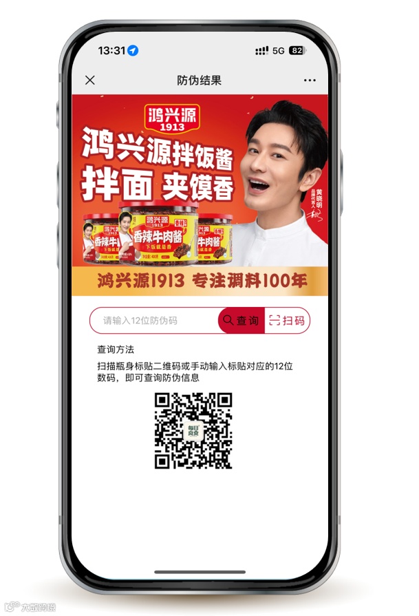 消费者在购买鸿兴源1913产品后,拿手机扫描罐身码即可查看产品真伪信息,安心在手,进一步提升对鸿兴源1913品牌的信任度。