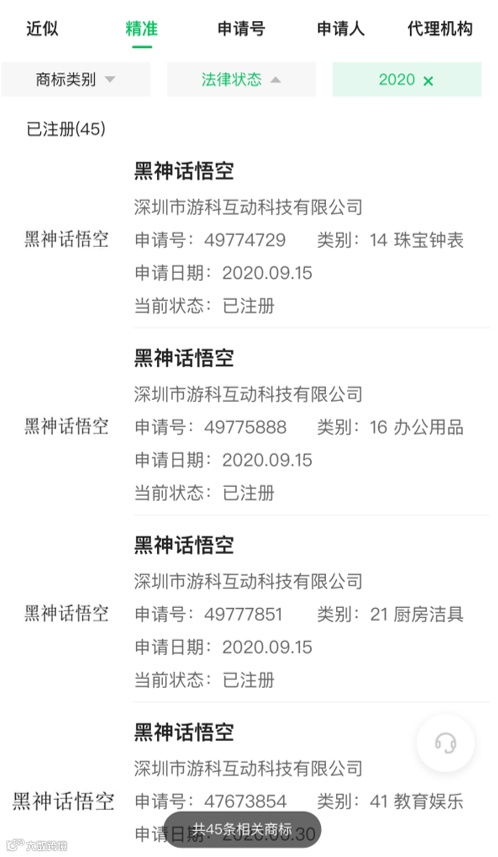 而早在4年前,《黑神话:悟空》就在为IP联名授权做准备了。2020年,该游戏制作商-深圳市游科互动科技有限公司已将“黑神话悟空”45类商标全部注册完成。
