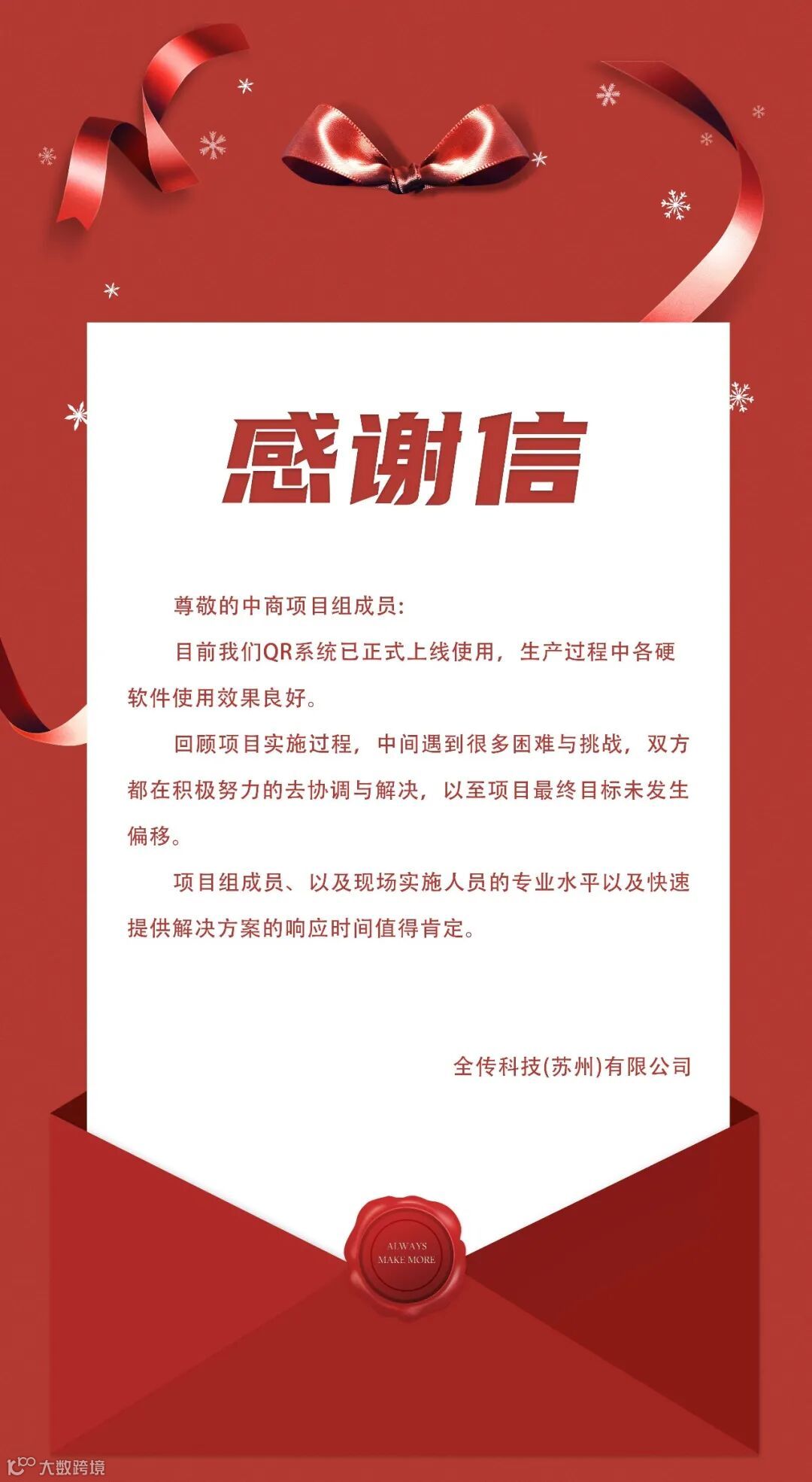 近日,全传科技一物一码防伪追溯项目验收总结会成功召开。会后,全传科技向CCN中商项目组致以感谢,对项目组的专业度、响应度给予肯定: