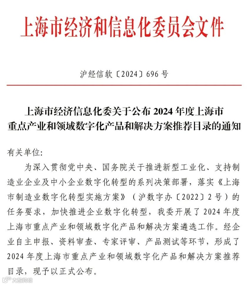 为深入贯彻党中央、国务院关于推进新型工业化、支持制造业企业及中小企业数字化转型的系列决策部署,落实《上海市制造业数字化转型实施方案》(沪数字办〔2022〕2号)的任务要求,加快推进企业数字化转型,上海市经信委开展了2024年度上海市重点产业和领域数字化产品和解决方案遴选工作。