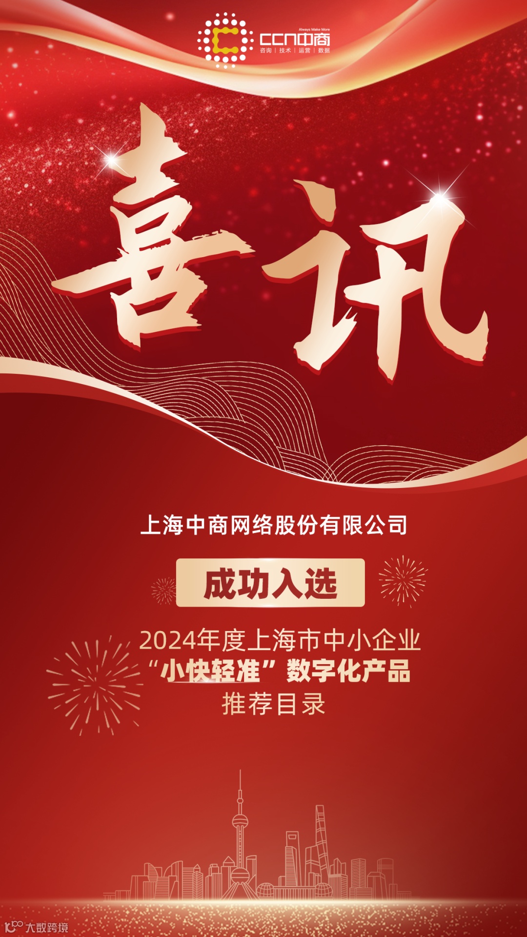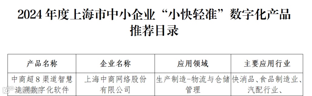 经企业自主申报、资料审查、专家评审、产品测试等环节,形成了2024年度上海市重点产业和领域数字化产品和解决方案推荐目录,上海中商网络股份有限公司成功入选。
