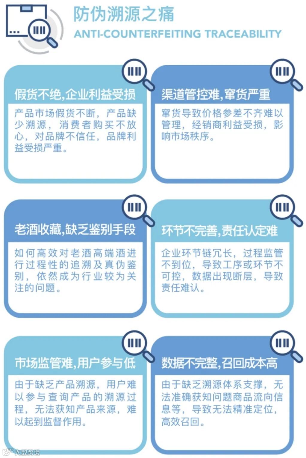 此次“可追溯食品”调研活动考察了各酒业内部的追溯体系及信息化建设,并与酒企负责人共同就“可追溯食品”话题展开了深度的沟通与交流,讨论了酒业的全链条追溯管理技术,物流管理体系等方面内容,互换经验,分享心得。CCN中商也结合市场现状和郭红芳女士在名酒企走访过程中的感悟剖析出以下行业痛点问题。