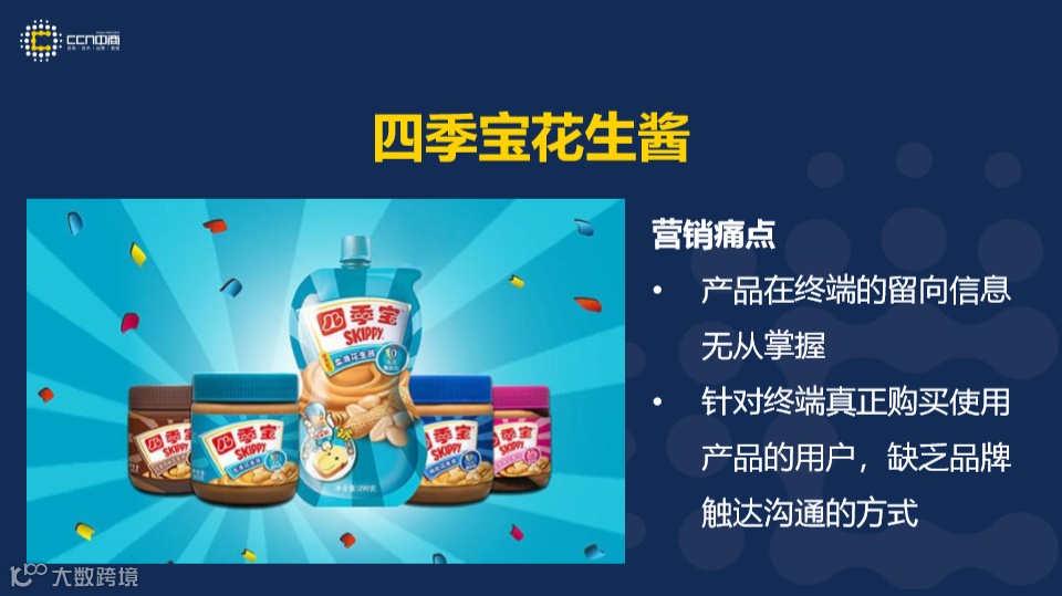 四季宝花生酱是庞赫然先生重点分享的另一个调味品企业营销案例。“四季宝”花生酱的营销痛点在于产品在终端的留向信息无从掌握和针对终端真正购买使用产品的用户,缺乏品牌触达沟通的方式。