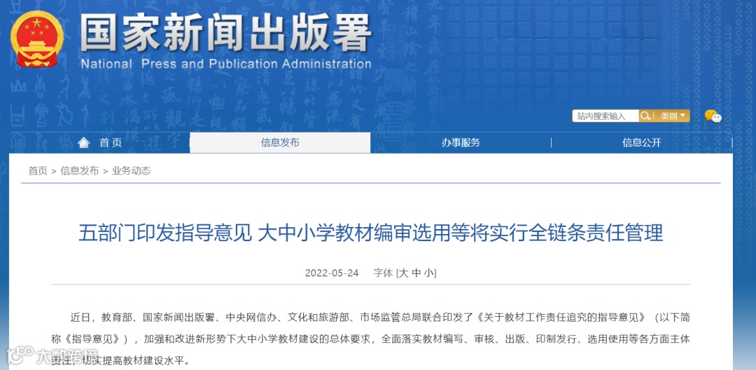 近日,教育部、国家新闻出版署、中央网信办、文化和旅游部、市场监管总局联合印发了《关于教材工作责任追究的指导意见》(以下简称《指导意见》)。